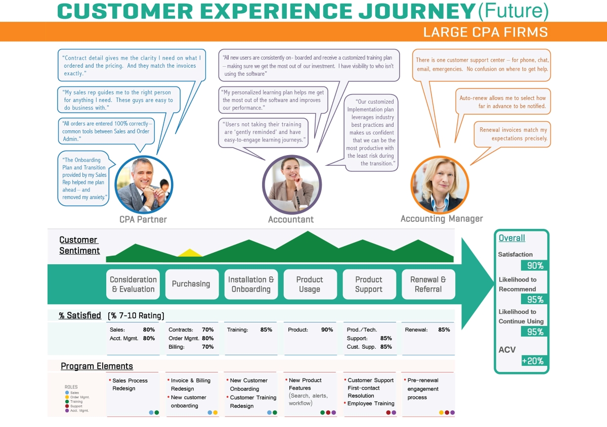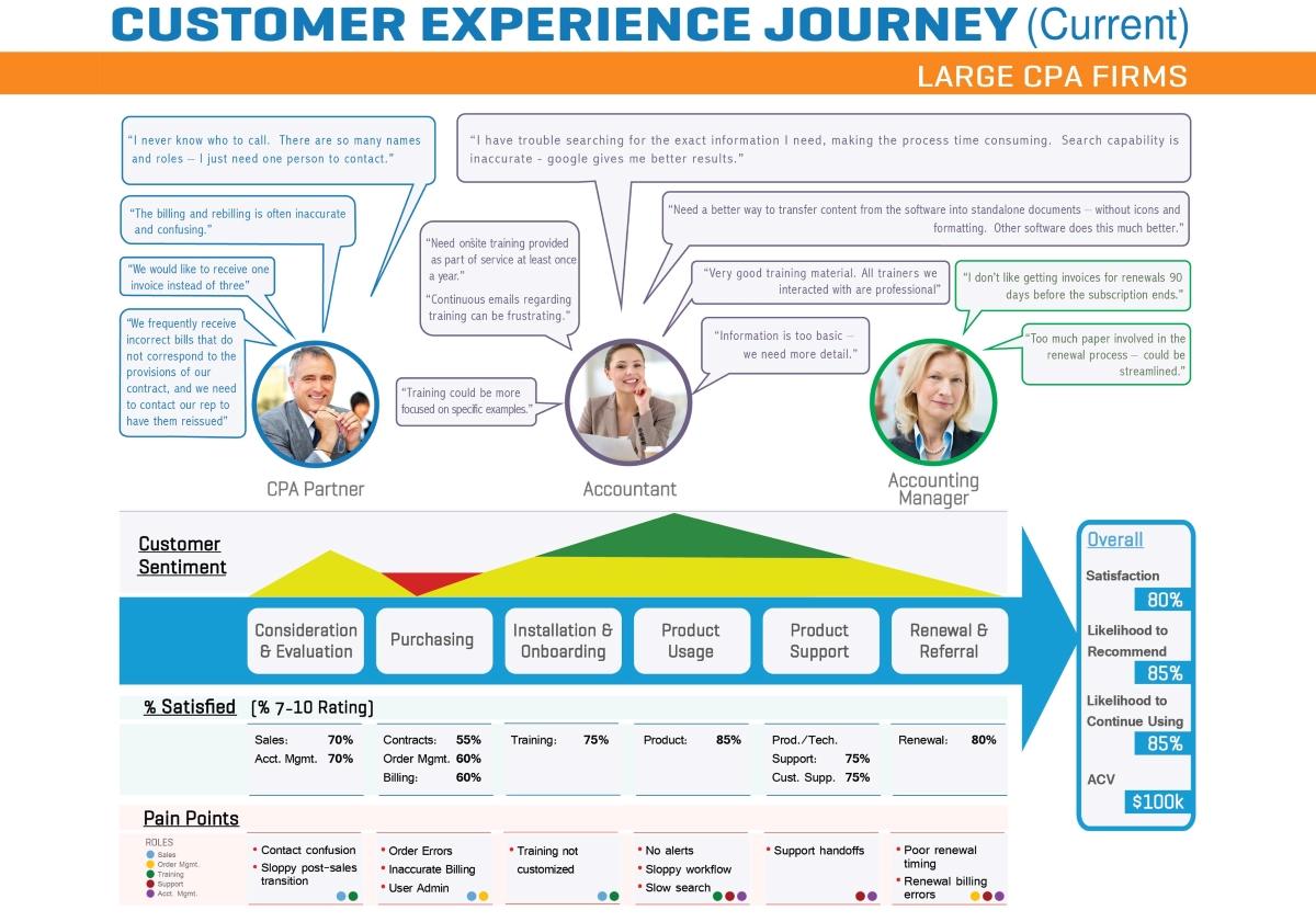 The customer journey – from the customers’ perspective – is crafted in a visual manner to integrate both the emotional, qualitative and quantitative information captured during the research. This “visual” journey map is customized for different types of customers, market segments or sales groups as needed to “tell the customer journey story” in a way that is much more effective than PowerPoint decks or dozens of charts and graphs.