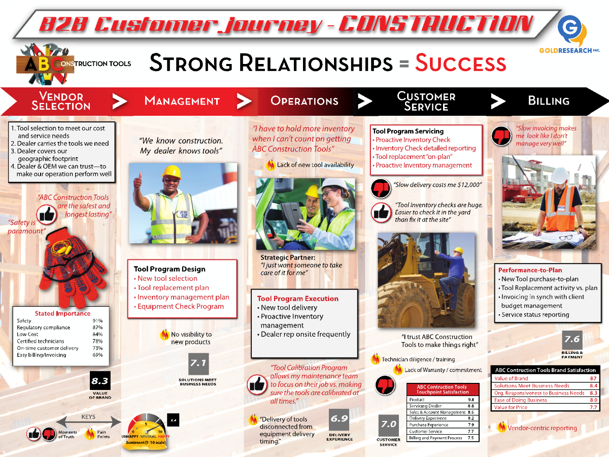 Based on historical research and the experience of cross-functional business leaders, a hypothesis journey map is developed, leveraging Gold Research’s vast experience base and knowledge. The key stages of a customer’s journey are outlined, critical moments of truth and pain points are gleaned from VoC data, market research and customer-facing employees. Research gaps are identified and a research plan is developed.
